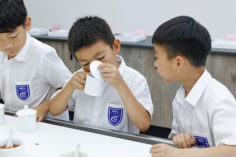 审评老师带领孩子们体验专业的茶叶审评流程,直观地感受不同茶类的色、香、味、形。随后在茶艺老师的引导下,孩子们自己上手,认真、专注地学习泡茶,老师们也喝上了学生亲手泡的茶。